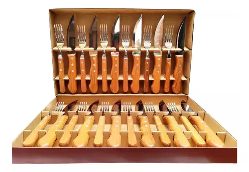 Con hojas de acero inoxidable y mangos de madera, garantiza durabilidad y resistencia. Incluye 12 cuchillos jumbo y 12 tenedores, perfectos para cortar y disfrutar de tus asados favoritos.